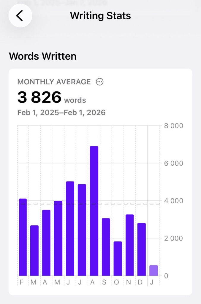 Screenshot of Writing Stats charts from the Time Atlas app.